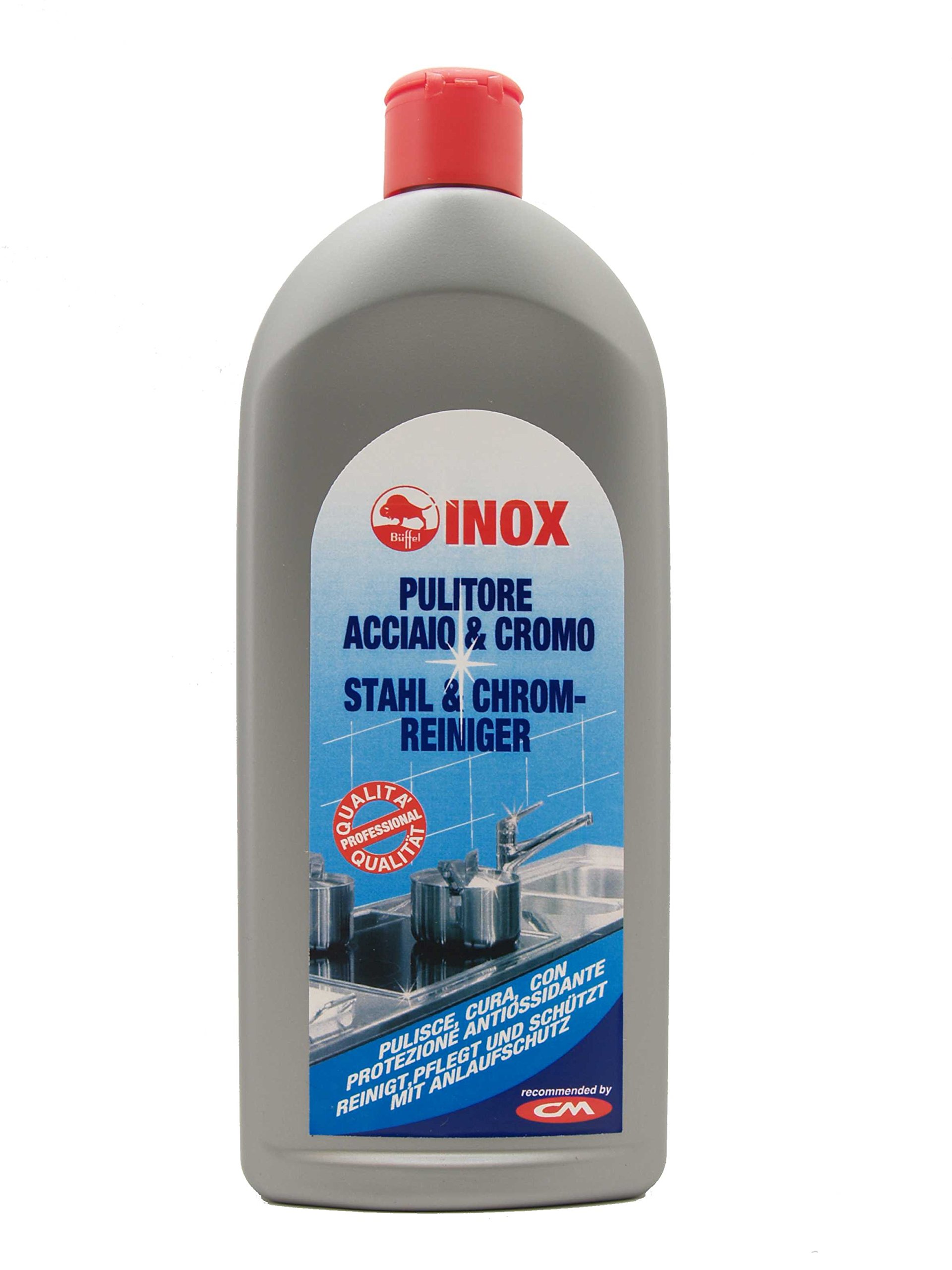 Pulisce cura e protegge. Appositamente creato per pulire e proteggere tutte le superfici in acciaio inox, lavelli, pentole, posate inox, oggetti cromati, piastre dei ferri da stiro in acciacio inossidabile lucido o cromo… Toglie senza fatica depositi di calcare, macchie di grasso e sporco dà splendore e preserva dal formarsi di gocce ritarda il riappannamento non irrita la pelle